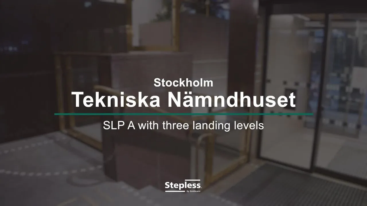 Stepless SLP model A løfteplatform er en specialløfteplatform med øvre og nedre låge samt et højt gelænder, der er tilpasset omgivelserne. I stedet for den nedre låge, er det muligt at vælge en rampe. Afhængigt af projektet kan gelændere og låger leveres i rustfrit stål, messing eller i en malet udgave.