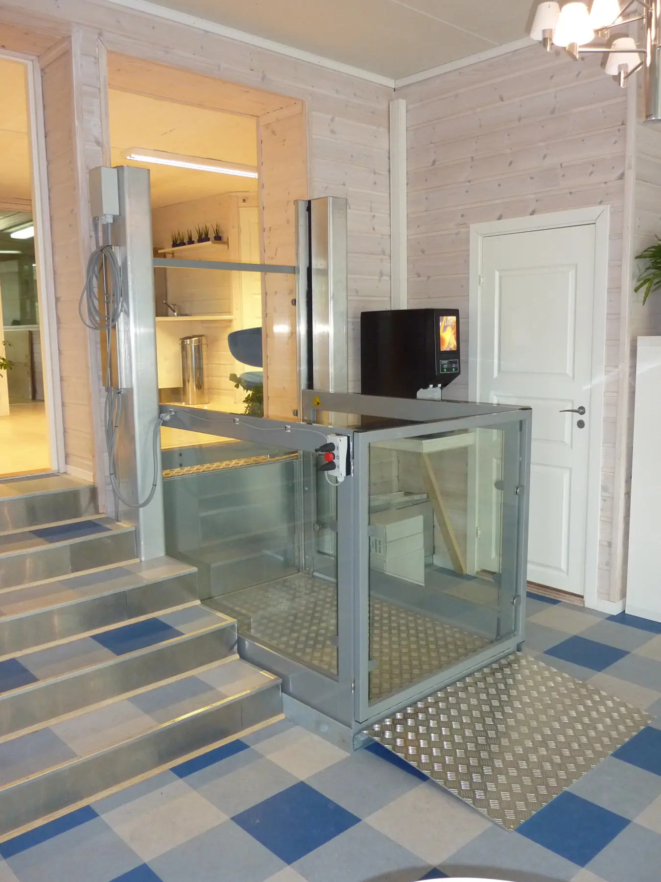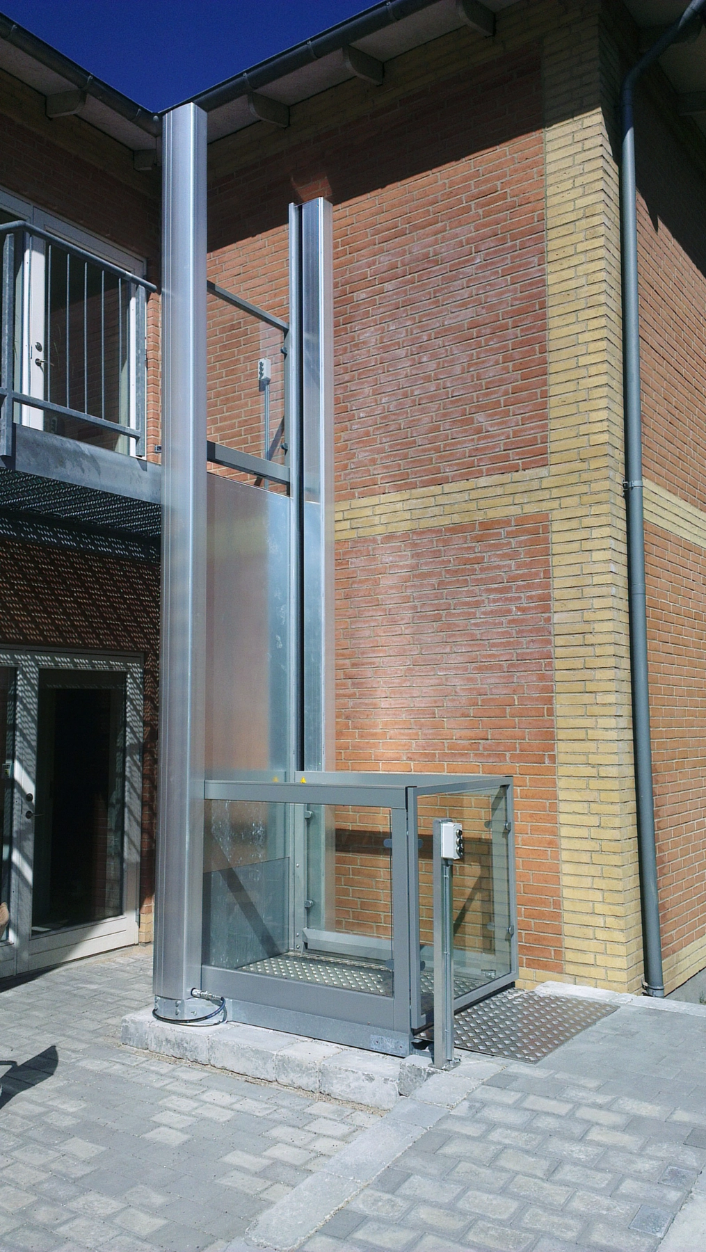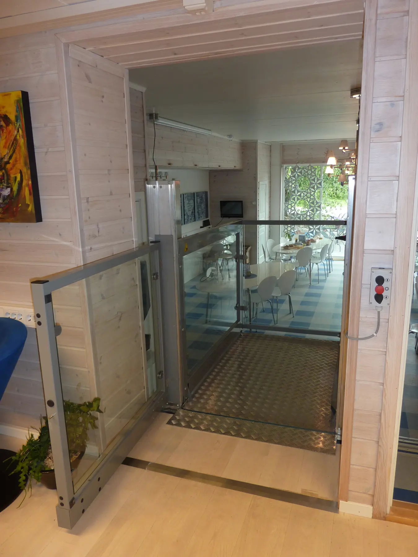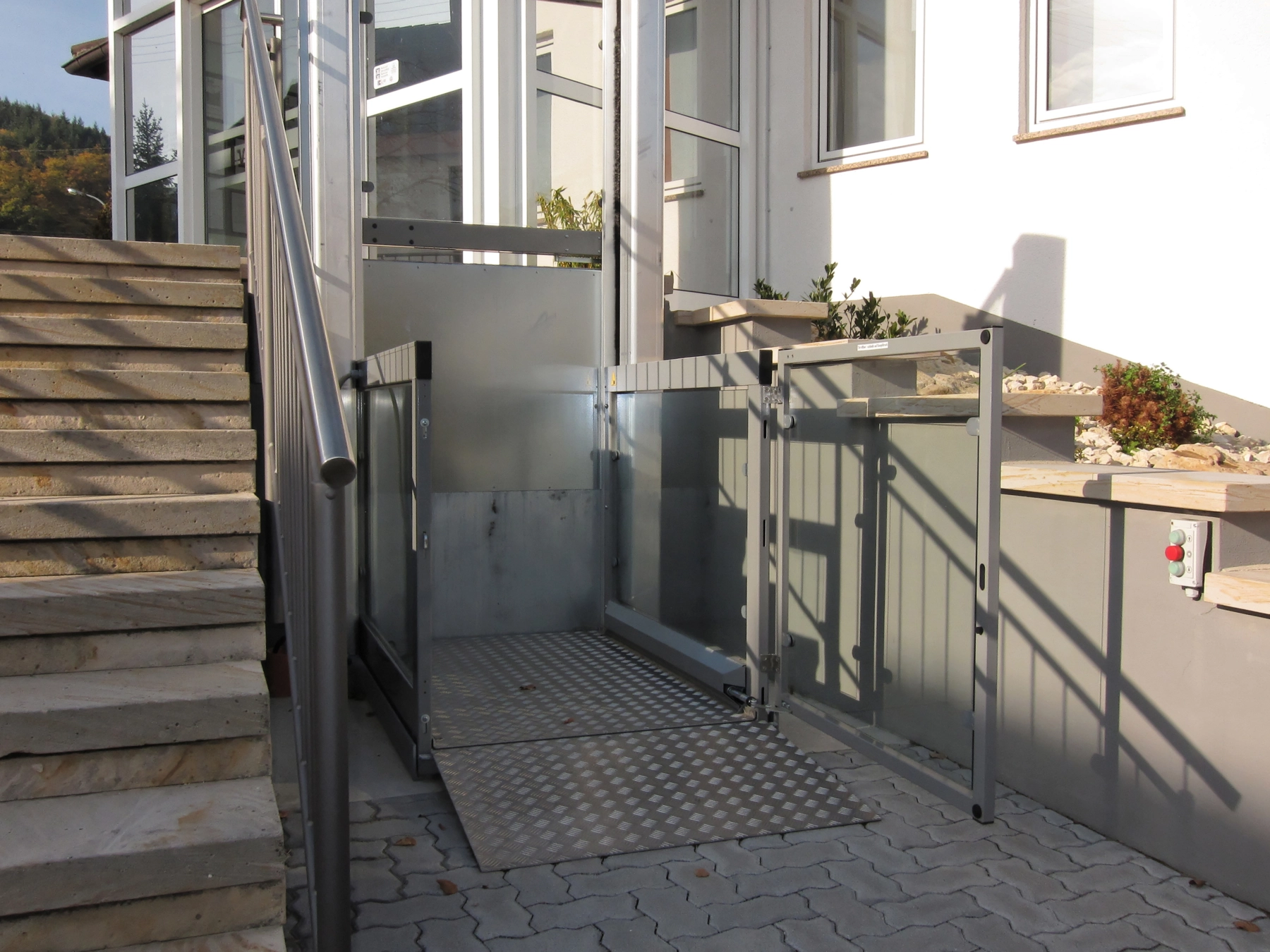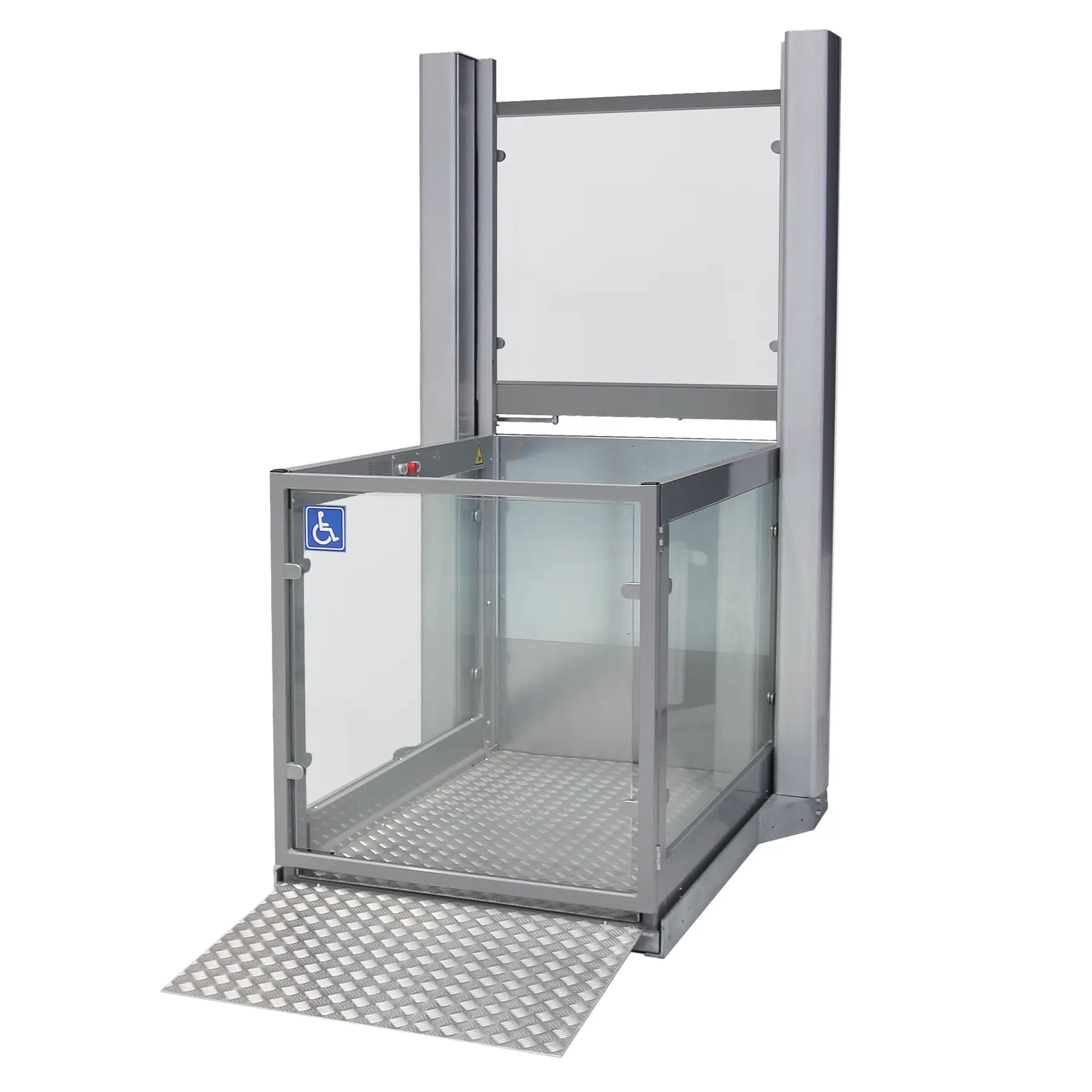 Diese Hebeplattform ermöglicht den meisten Benutzern, ohne weitere Hilfe große Höhenunterschiede zu überwinden. Die Plattform bietet leicht erreichbare Bedientasten und ist mit Bedienfeldern für die obere und die untere Ebene ausgestattet. Die Türen öffnen und schließen automatisch.