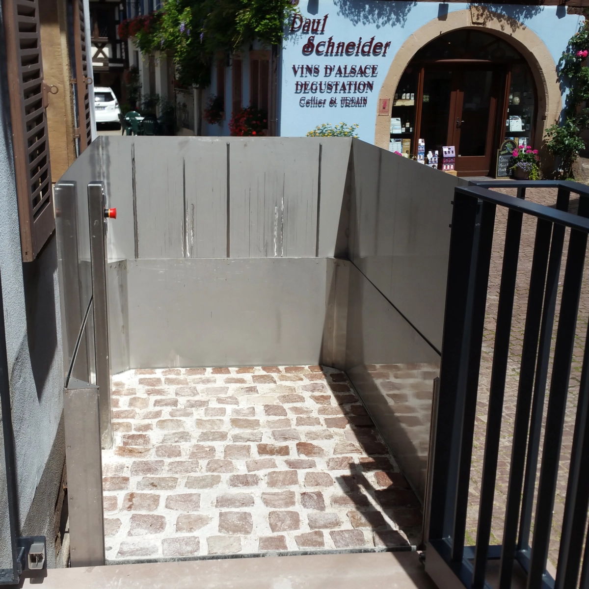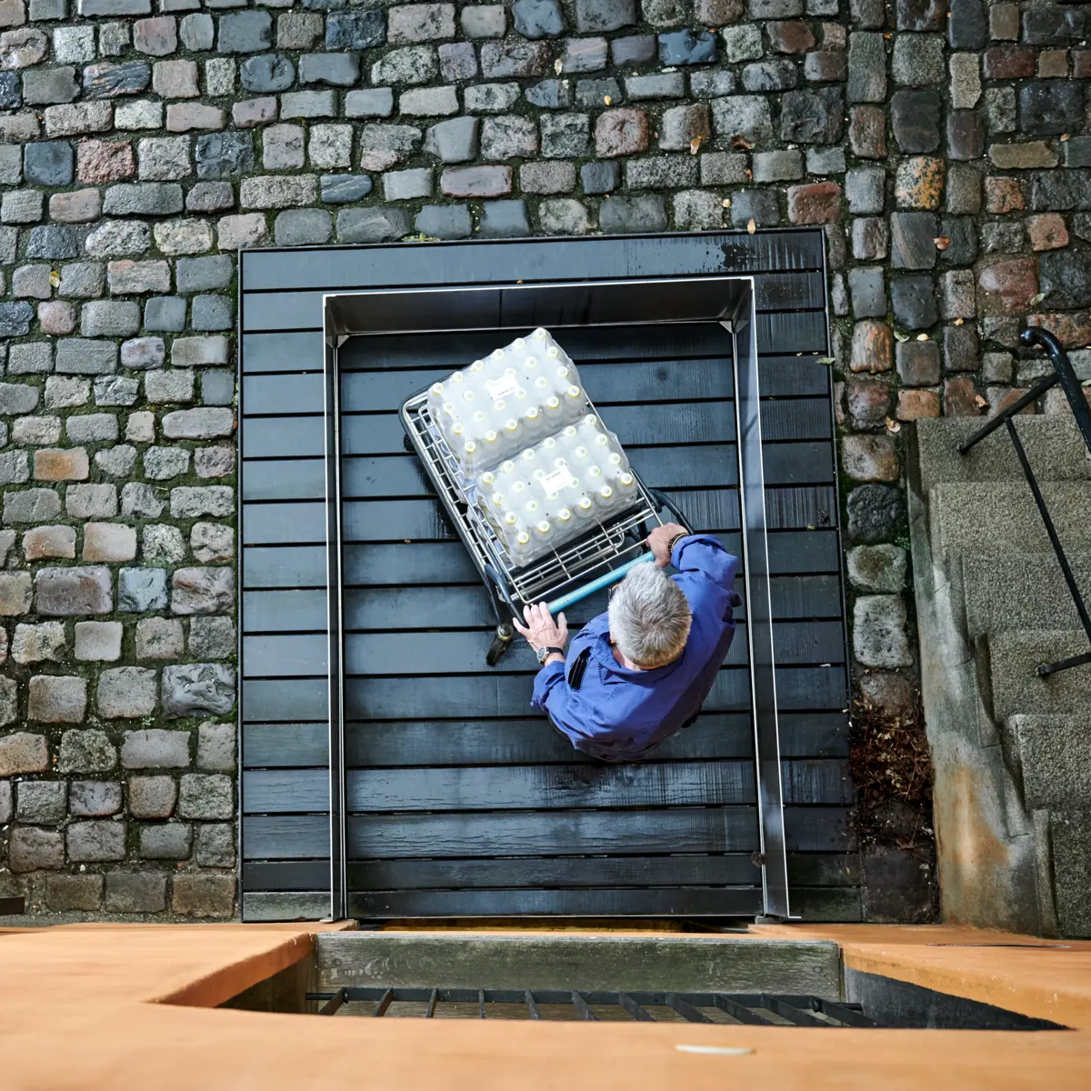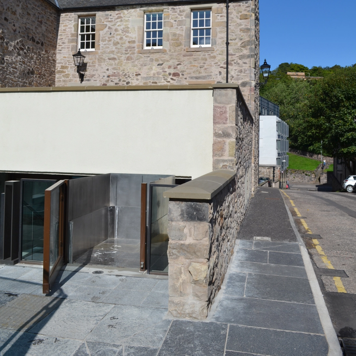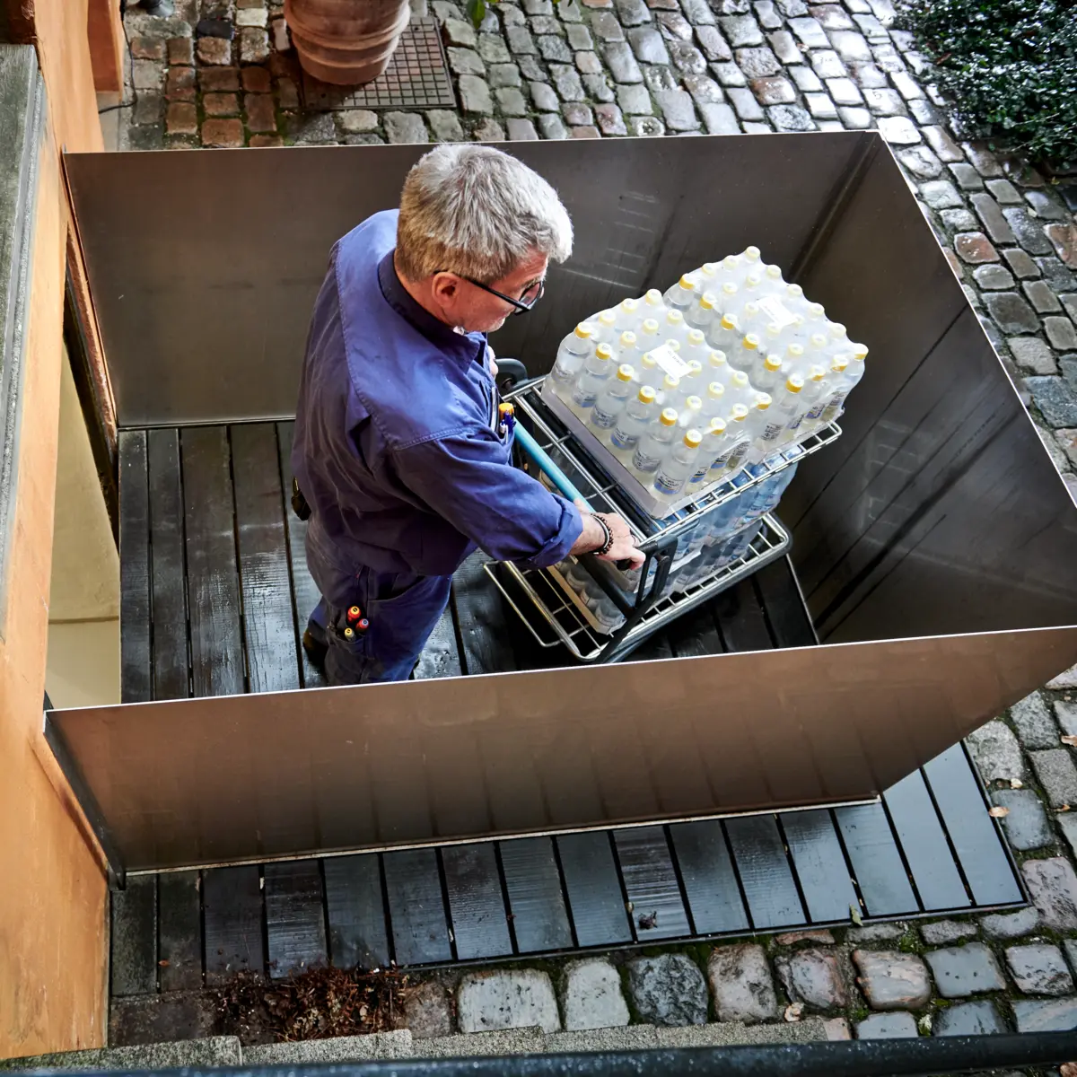Die Stepless SLP B Hebeplattform ist ein maßgefertigtes Modell, bei dem sowohl die Plattform als auch die hohe Abrollsicherung in einen vorgefertigten Schacht im Boden eingebaut werden. Dadurch ist sie im Ruhezustand nahezu unsichtbar. Die SLP B Hebeplattform kann so angepasst werden, dass sie sich elegant in ihre Umgebung einfügt. Sie kann fast jede Art von Oberfläche erhalten – zum Beispiel Kopfstein, Fliesen oder Pflasterstein – um sicherzustellen, dass sie diskret mit ihrer Umgebung verschmilzt.