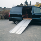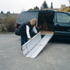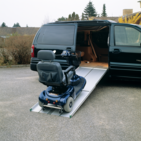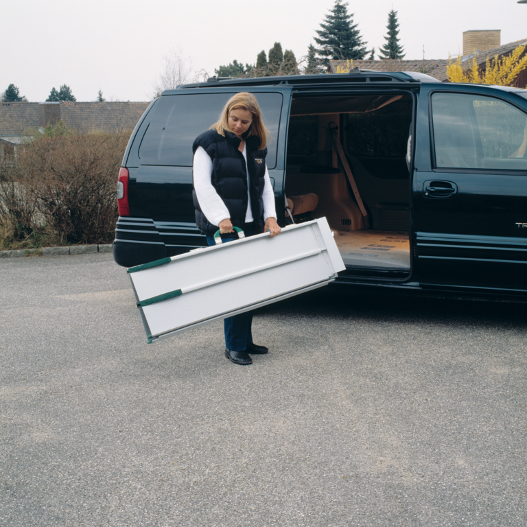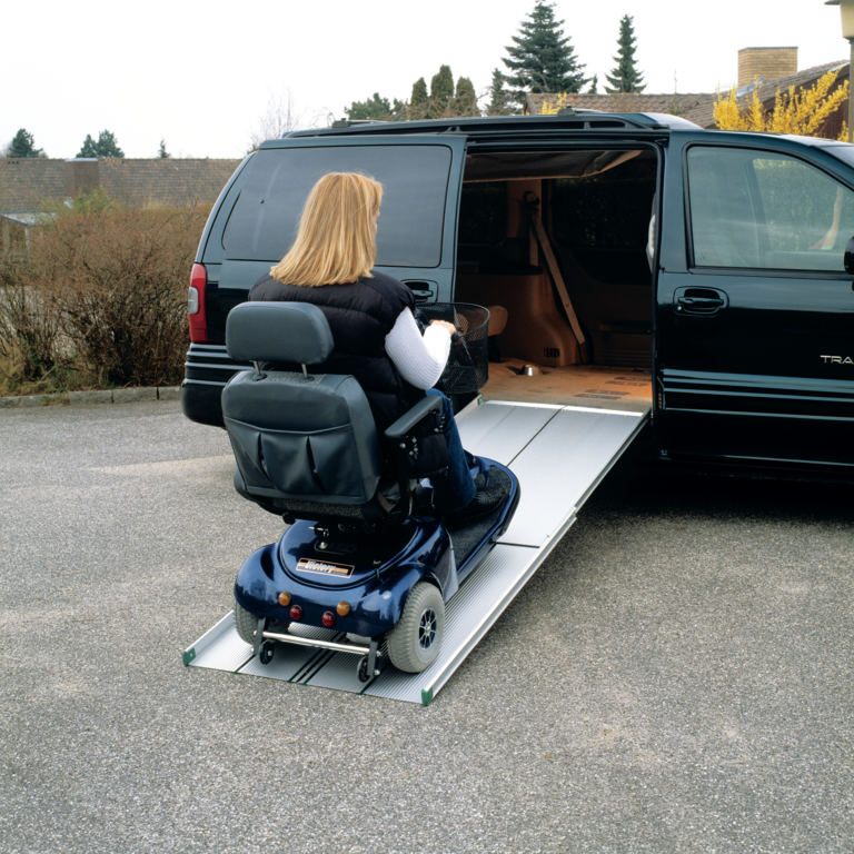 Die längenverschiebbare EasyFold Rampe ist sowohl für elektrische Rollstühle als auch für Elektromobile geeignet, da sie eine breite Fahrfläche ohne hohe Kanten bietet, die die Räder behindern würden.