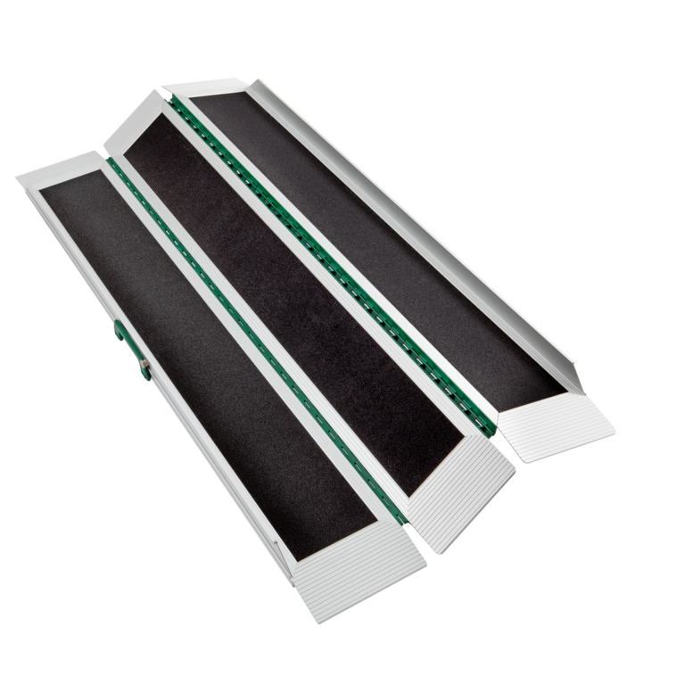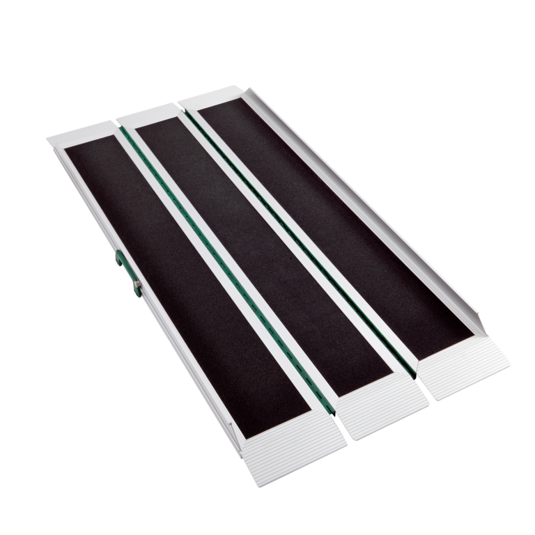 The Stepless EasyFold Pro3 ramp is a robust model that is ideal for use with electric wheelchairs and mobility scooters, thanks to its wide driving surface and high weight capacity. The EasyFold Pro3 ramp can be folded lengthwise so that it only takes up a third of its extended length.