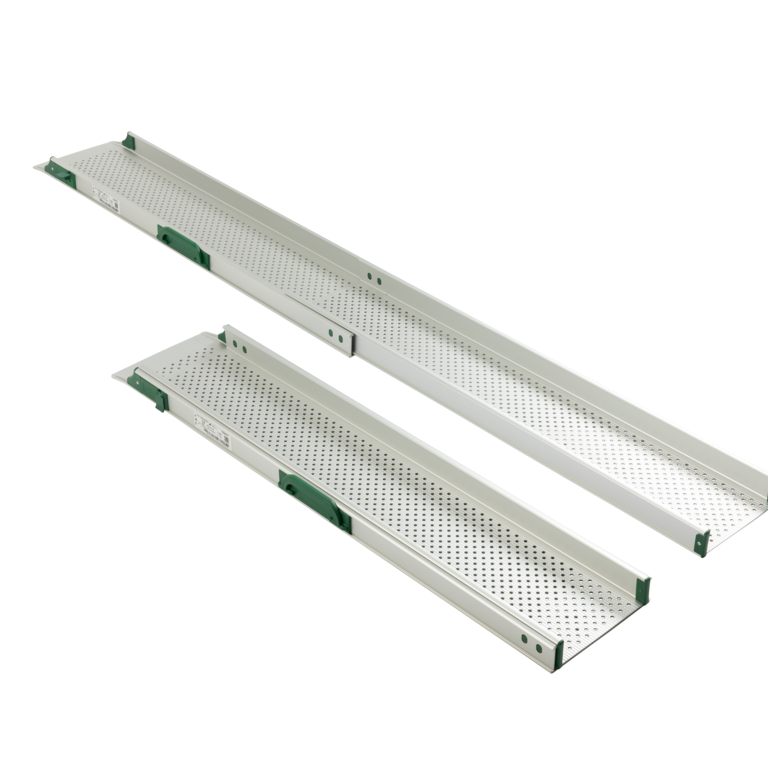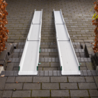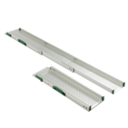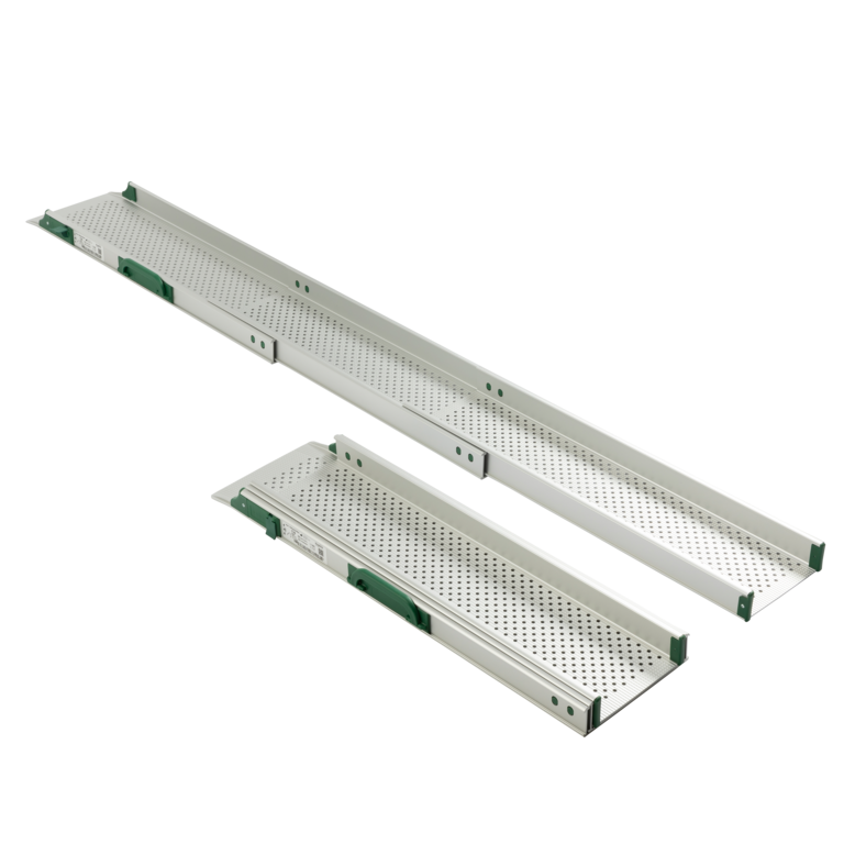 Stepless telescopic ramps are available in different lengths with either two or three telescopic pieces to accommodate different needs. It is simple to extend the ramp sections to the required length and push them together again to create a shorter ramp as required. A simple locking mechanism makes sure the ramp remains fixed at the selected length both during transport and when in use.