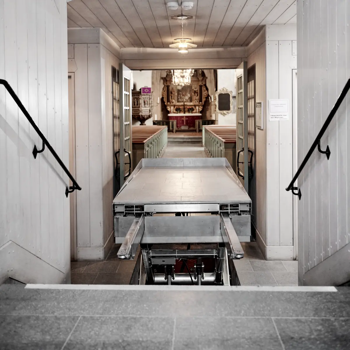 La plateforme élévatrice SLP H de Stepless est une plateforme élévatrice intégrée au sol devant des escaliers, sans nécessiter de modifications sur les escaliers ni dans la pièce.