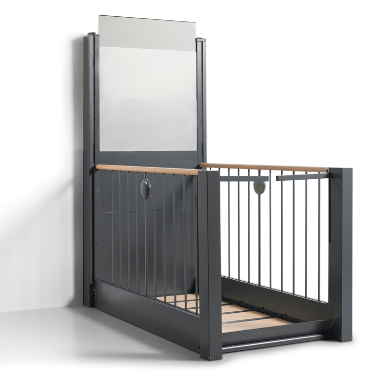 Le panneau de commande est intuitif et permet un fonctionnement indépendant pour tous les utilisateurs. La sécurité est une priorité grâce à des fonctionnalités telles que des capteurs anti-écrasement, une rampe/garde roulante, un portillon de sécurité électrique au palier supérieur, des bras de sécurité en option, une protection contre les surcharges et une batterie de secours.