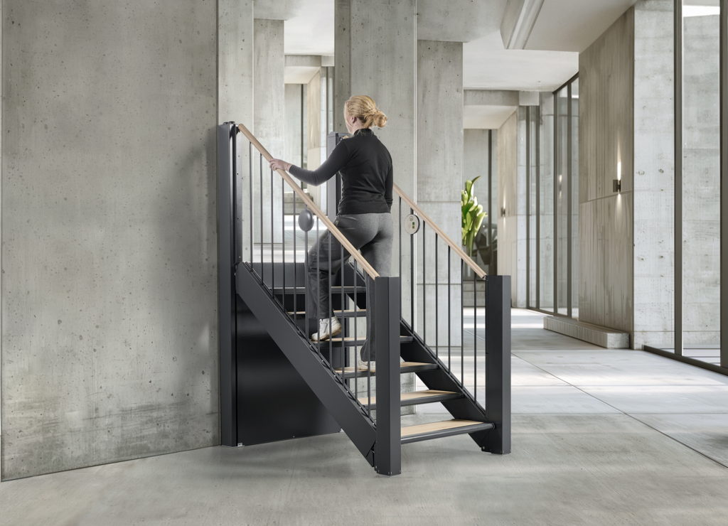 StepOne provides accessibility by transforming stairs into a platform lift without requiring structural changes. It can be adapted to both new and existing environments, and the configurator now lets users tailor every detail online.
