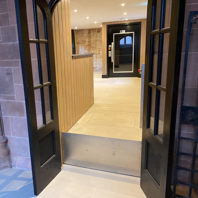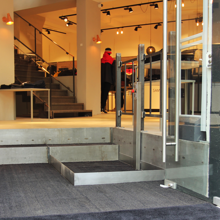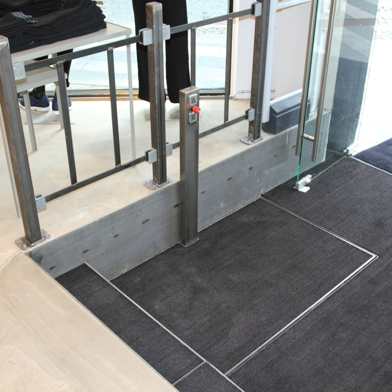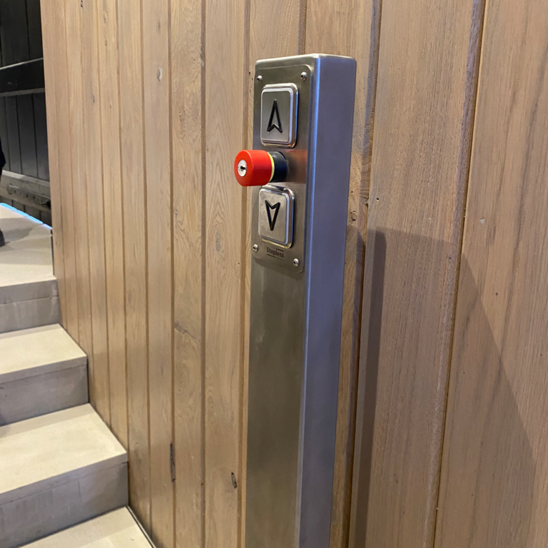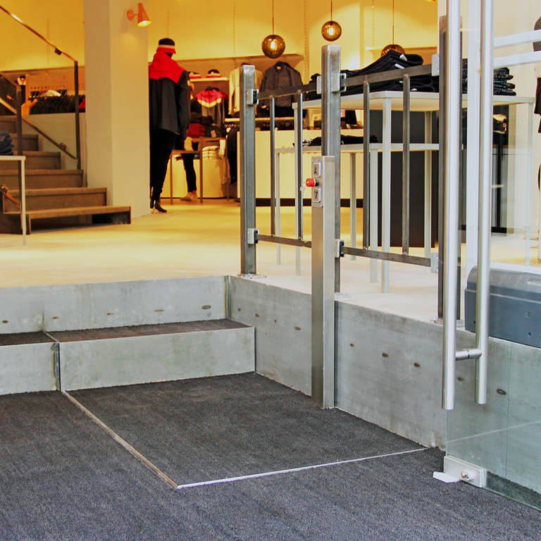 Det brukes samme materiale til plattformens belegg som på de andre trinnene, og dermed blir løfteplattformen en vakker og nesten usynlig del av miljøet rundt, uansett om trappen er laget av klinker, stein eller tre.