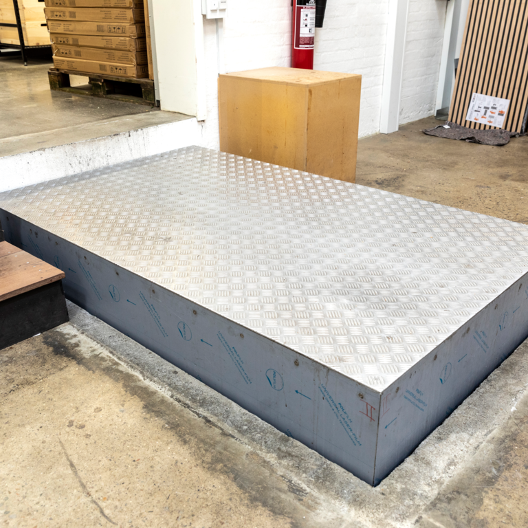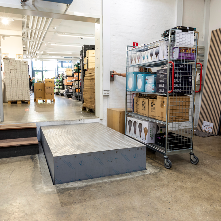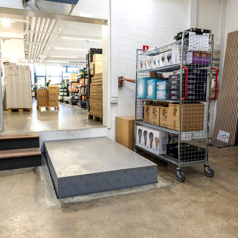 Løfteplattformen bygges inn i gulvet på nederste plan og kan løftes til repos eller annen nivåforskjell - eller den kan plasseres som frittstående plattform.