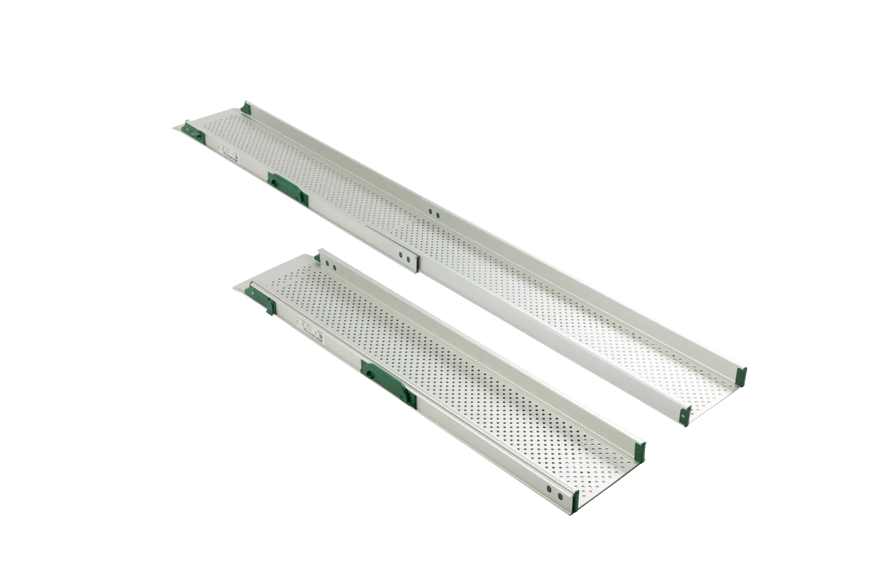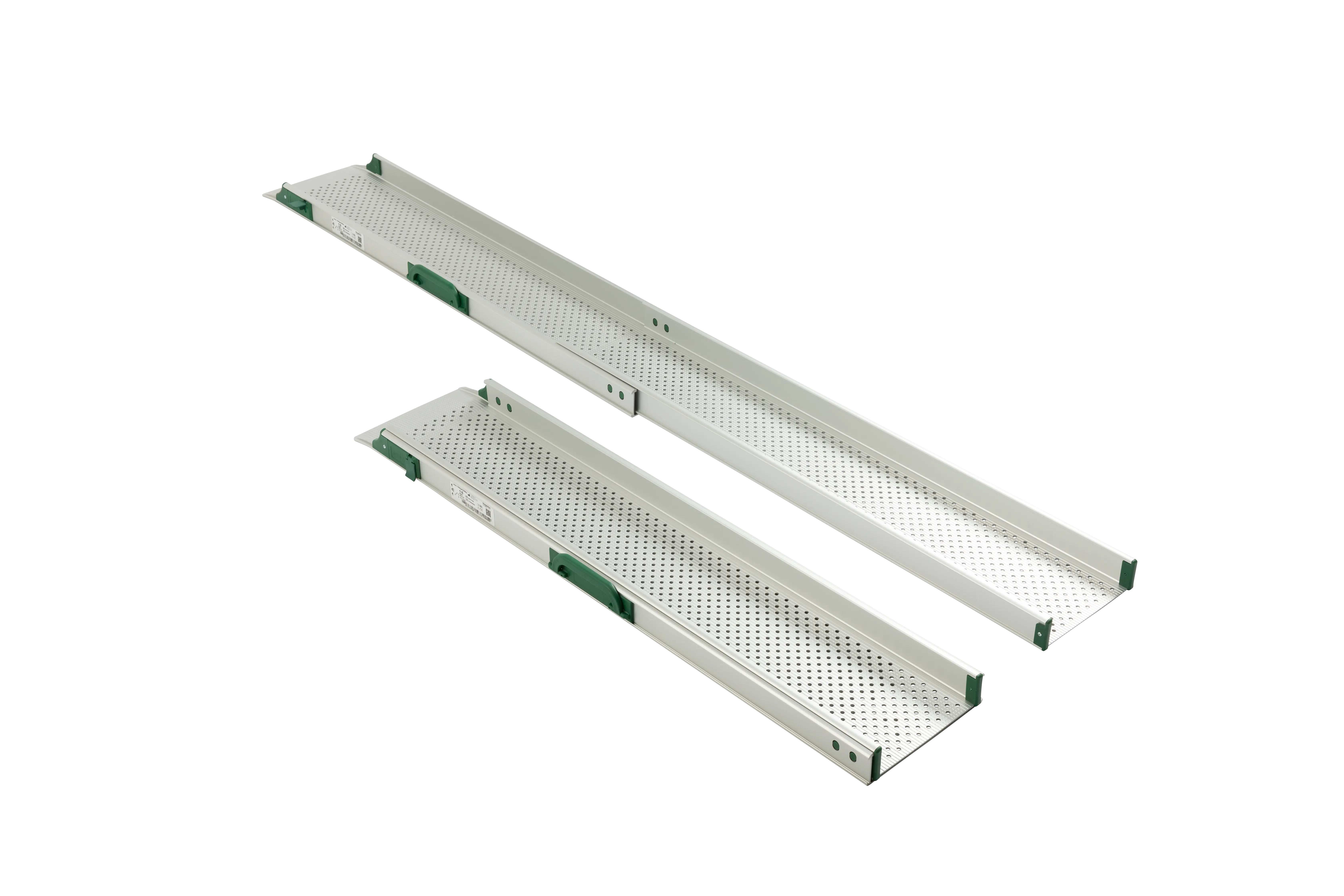 Stepless lengdeforskyvningsrampe er tilgjengelig i forskjellige lengder med enten to eller tre lengdeskift. Det er enkelt å forlenge rampene til ønsket lengde og skyve dem sammen for en kortere versjon etter behov. En enkel låsemekanisme sørger for at rampene holdes i innstilt lengde, både under transport og under bruk.