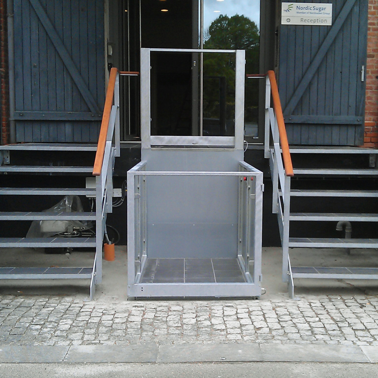Stepless lyftplattform SLP A är en skräddarsydd modell med övre och nedre grindar allt för att anpassa till miljön. Man kan även välja att montera en ramp i stället för den nedre grinden. Räcken och grindar finns tillgängliga i rostfritt stål eller målade i olika färger beroende på projektkraven.