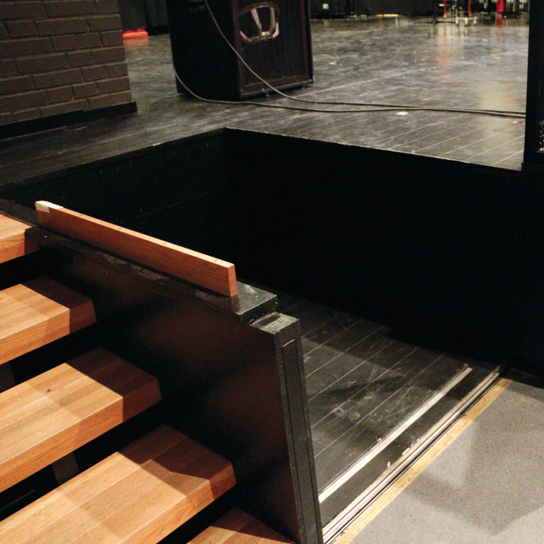 Plattformen har inga ledstänger eftersom brukaren hålls säkert på plats av schaktets sidor.