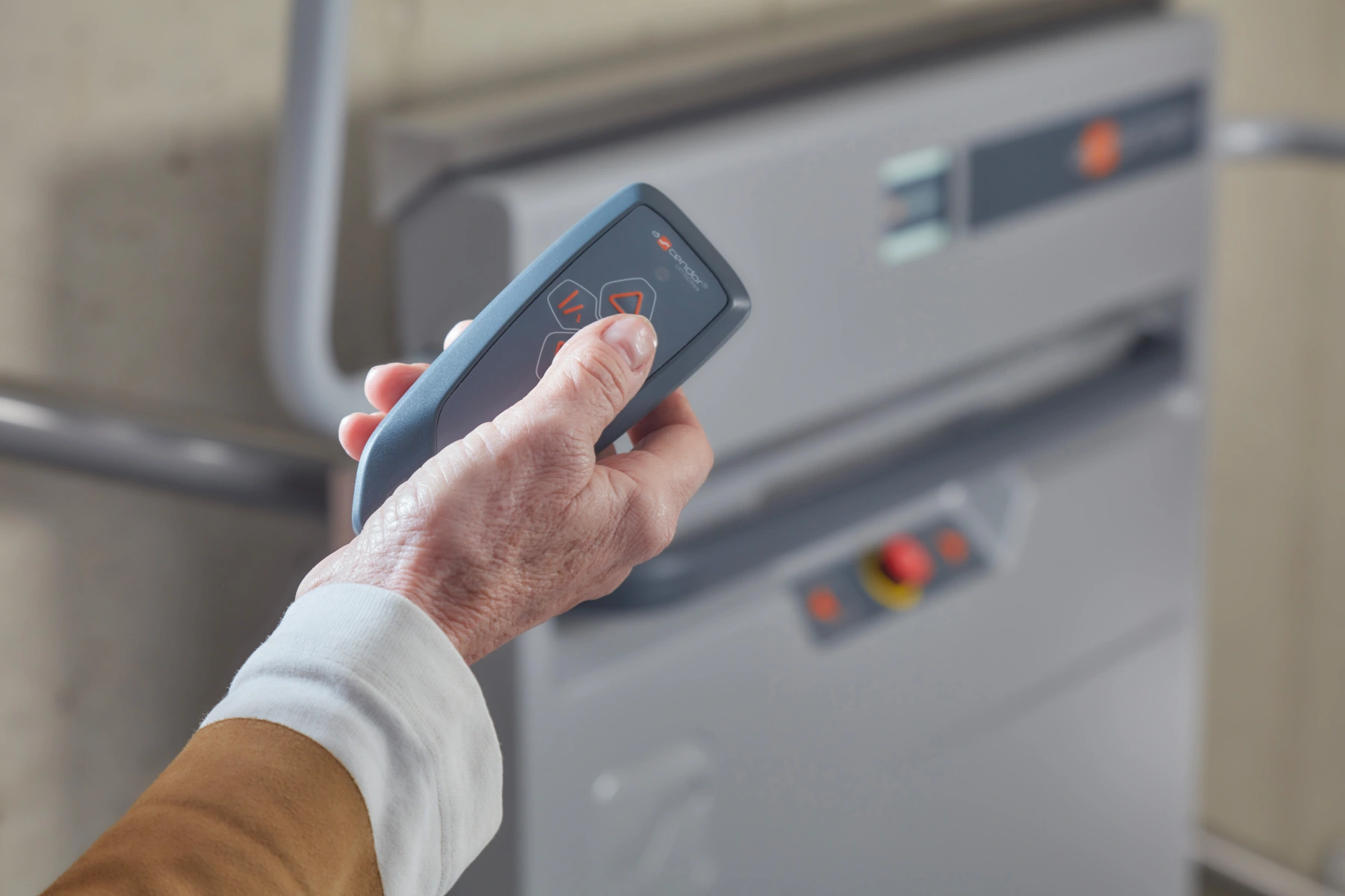 Trapplyften Stepless TL20 har en diskret formgivning som får den att smälta in i trappkonstruktionen och en lättmanövrerad kontrollpanel för brukaren.